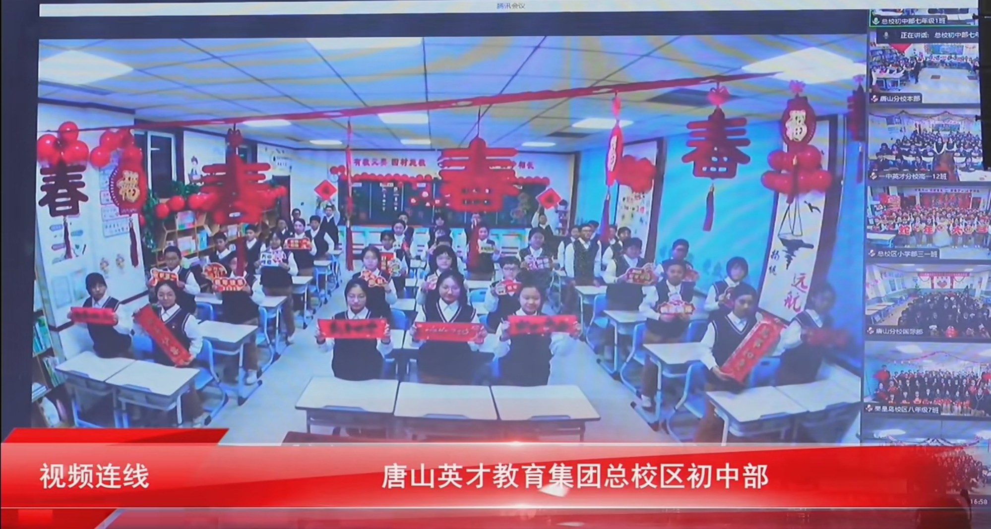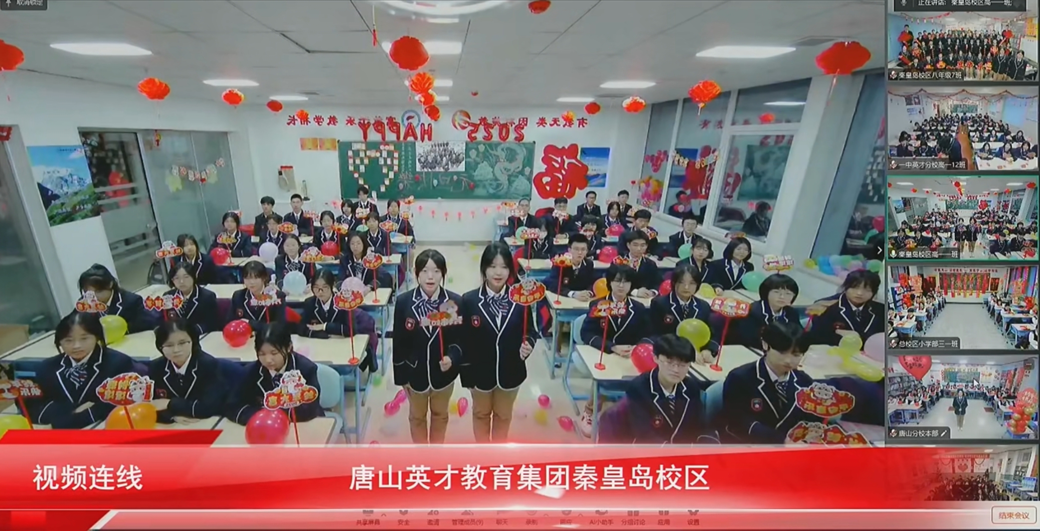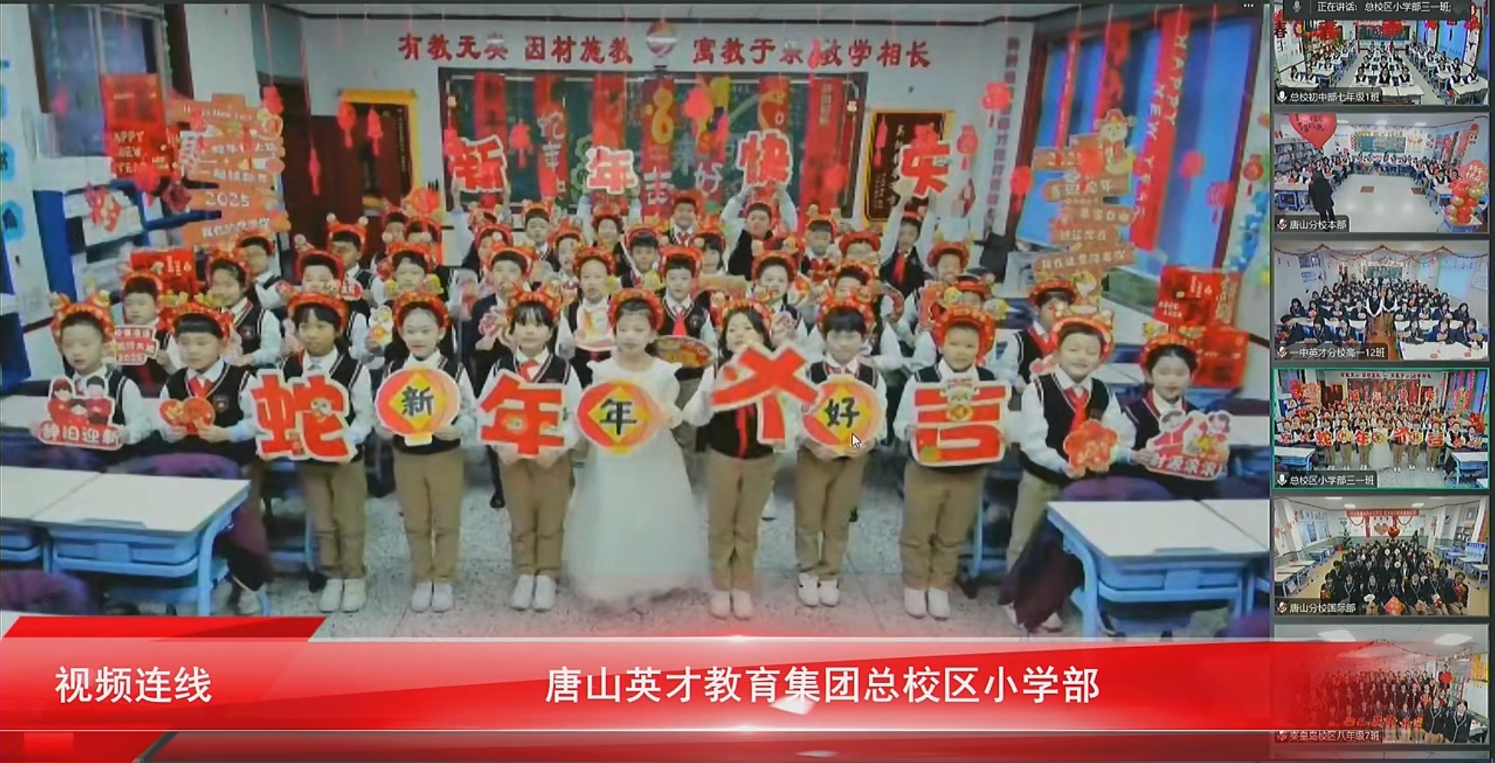 “春风化雨育桃李,润物无声洒春晖”。英才的学生一个个朝气蓬勃、天真烂漫,英才经过24年的发展,现已覆盖唐秦二市,拥有四个校区,八个学部,两个公司,两个办事处,两个基地,在校学生8700人,教职工970人,在此欢聚时刻,四校八部的同学们通过线上连线的方式为现场的领导、家长、同学们送上新年祝福。