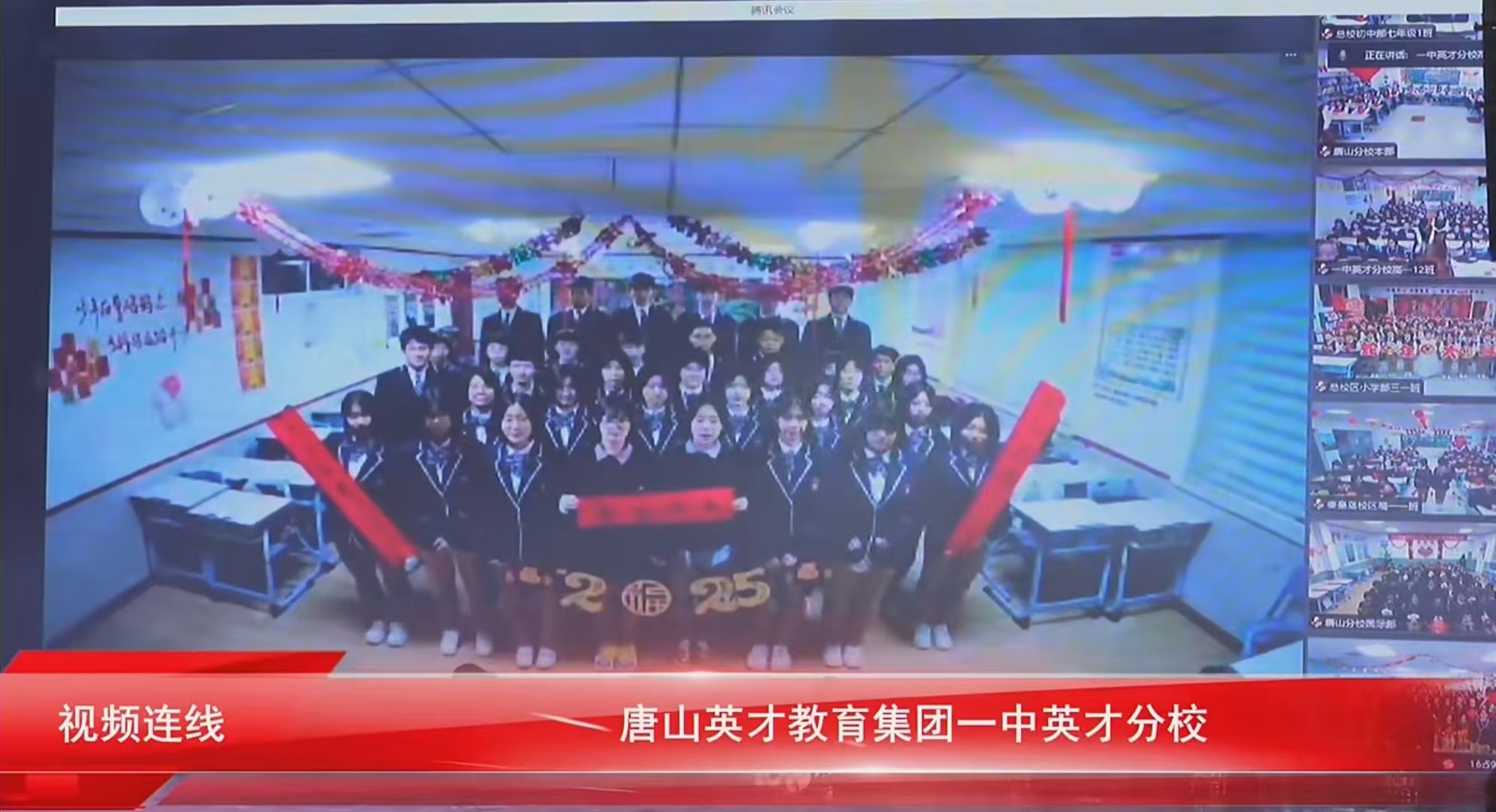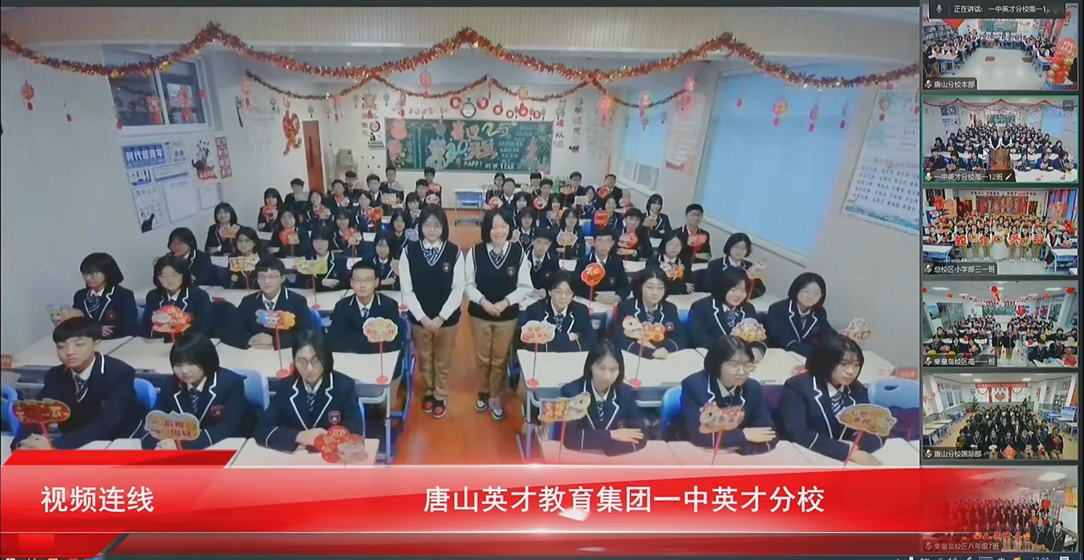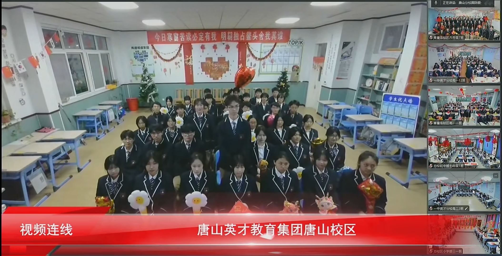 “春风化雨育桃李,润物无声洒春晖”。英才的学生一个个朝气蓬勃、天真烂漫,英才经过24年的发展,现已覆盖唐秦二市,拥有四个校区,八个学部,两个公司,两个办事处,两个基地,在校学生8700人,教职工970人,在此欢聚时刻,四校八部的同学们通过线上连线的方式为现场的领导、家长、同学们送上新年祝福。
