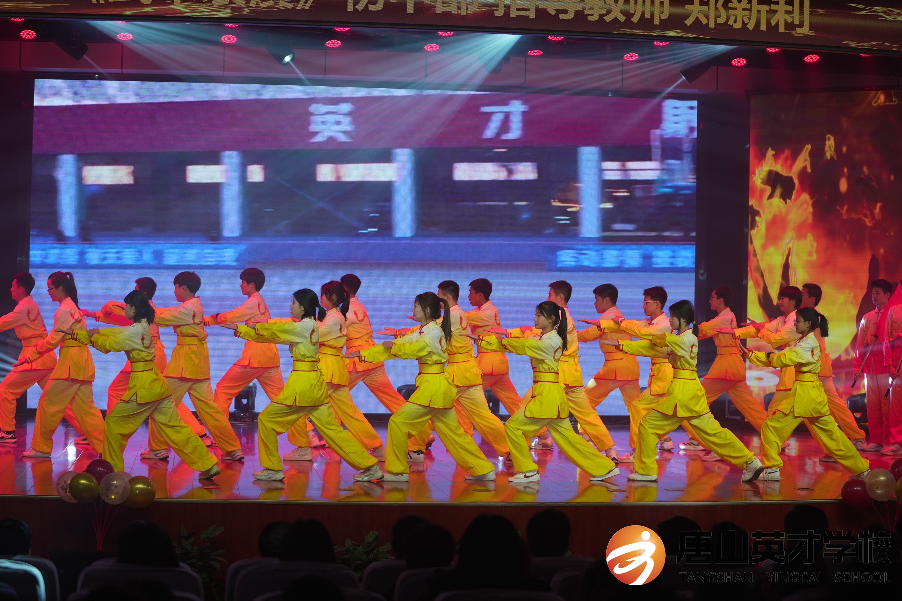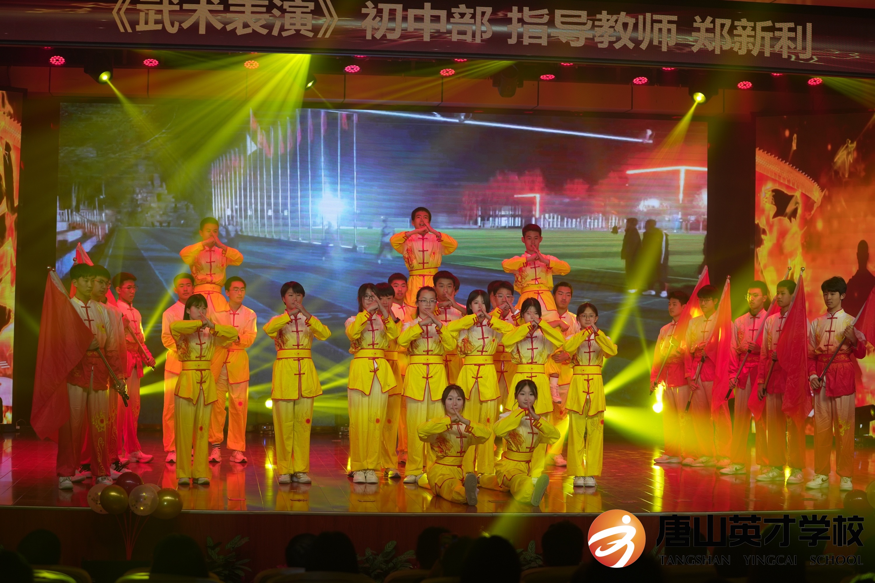 金戈铁马铿锵回响,激昂的乐声如骤雨般响起,英才田径队的同学们抱拳行礼,眼神坚毅,武术动作行云流水,刚柔并济,他们将武术的力与美完美结合,展示中华武术的魅力,彰显中华少年的朝气。
